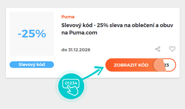 Vyberte si konkrétní slevový kód na naší stránce, který si chcete uplatnit v eshopu Puma.cz. Klikněte na oranžové tlačítko "Zobrazit kód".