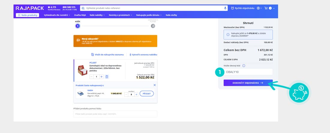 Vyberte si produkt v eshopu Rajapack.cz, o který máte zájem, stiskněte tlačítko "Košík" a produkt se automaticky vloží do nákupního košíku. Přímo v nákupním košíku vedle vybraných produktů klikněte na políčko "Vložte slevový kód". Zde vložte zkopírovaný slevový kód nebo jej ručně vepište a potvrďte tlačítkem "Dokončit objednávku".
