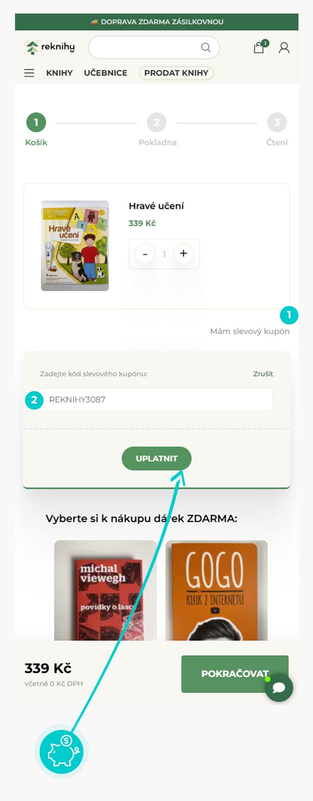 Vyberte si produkt v e-shopu Reknihy.cz, o který máte zájem, stiskněte tlačítko "Přidat do košíku" a produkt se automaticky vloží do nákupního košíku. Přímo v nákupním košíku najdete pod vámi vybraným produktem políčko "Použít slevový kupón". Zde vložte zkopírovaný slevový kód nebo jej ručně vepište a potvrďte tlačítkem "Použít kupón".
