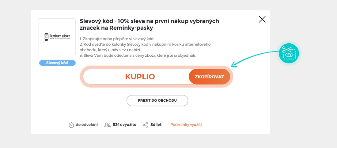 Zkopírujte nebo si opište slevový kód a klikněte na tlačítko "Přejít do obchodu". Následně budete přesměrováni přímo do eshopu Reminky-pasky.cz.