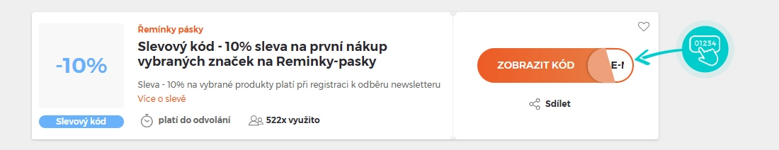 Vyberte si konkrétní slevový kód na naší stránce, který si chcete uplatnit v eshopu Reminky-pasky.cz. Klikněte na oranžové tlačítko "Zobrazit kód".