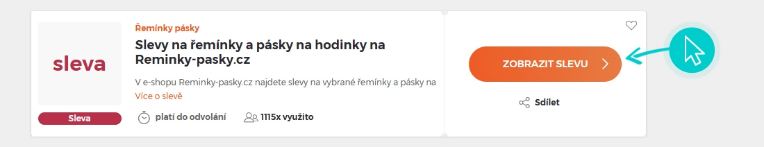 Vyberte si na naší stránce konkrétní Řemínky pásky slevu a klikněte na tlačítko "Zobrazit slevu". Automaticky budete přesměrováni přímo na akční nabídku v internetovém obchodě Reminky-pasky.cz, kde můžete produkt nakoupit se slevou.