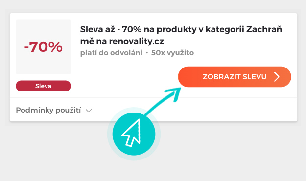 Vyberte si na naší stránce konkrétní renovality slevu a klikněte na tlačítko "Získej slevu". Automaticky budete přesměrováni přímo na akční nabídku v internetovém obchodě renovality.cz, kde můžete produkt nakoupit se slevou.