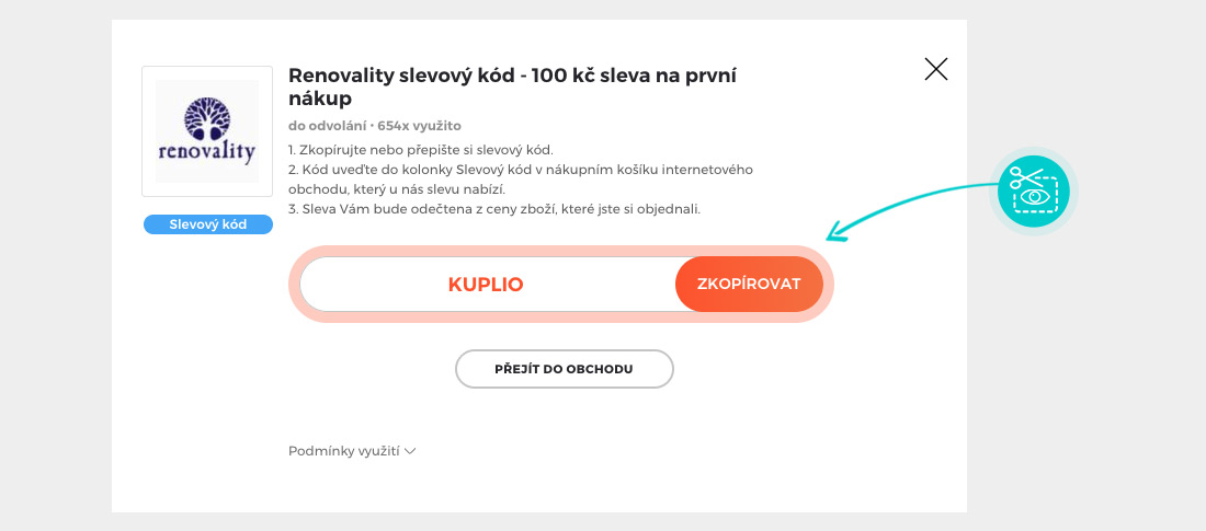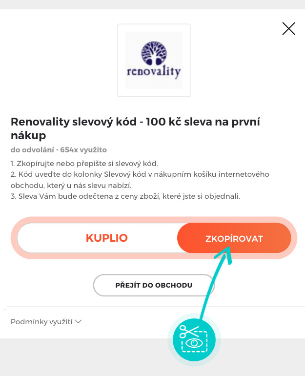 Zkopírujte nebo si opište slevový kód a klikněte na tlačítko "Přejít do obchodu". Následně budete přesměrováni přímo do e-shopu renovality.cz.