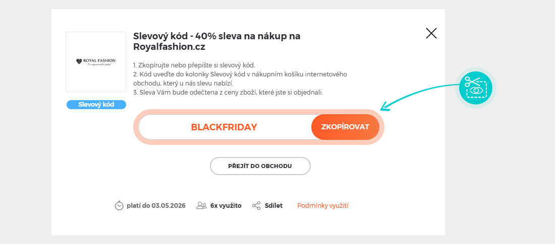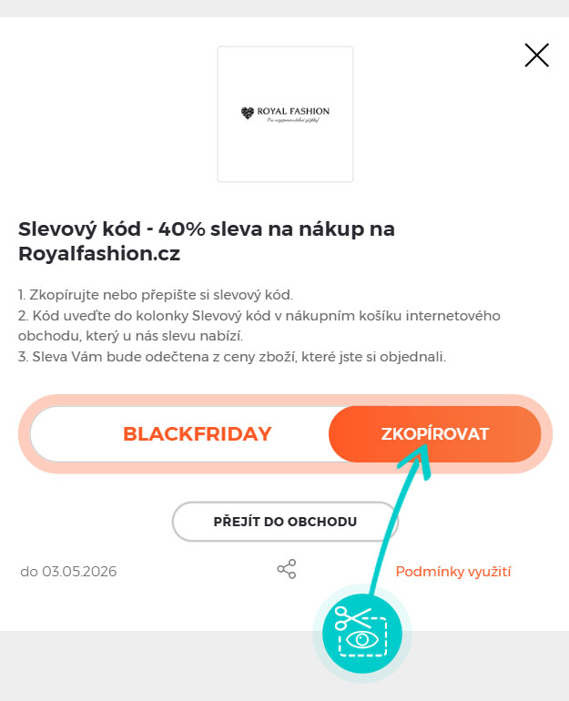 Zkopírujte nebo si opište slevový kód a klikněte na tlačítko "Přejít do obchodu". Následně budete přesměrováni přímo do e-shopu Royalfashion.cz.
