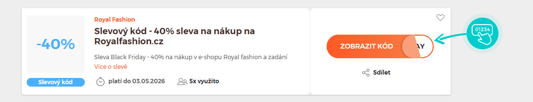 Vyberte si konkrétní slevový kód na naší stránce, který si chcete uplatnit v e-shopu Royalfashion.cz. Klikněte na oranžové tlačítko "Zobrazit kód".