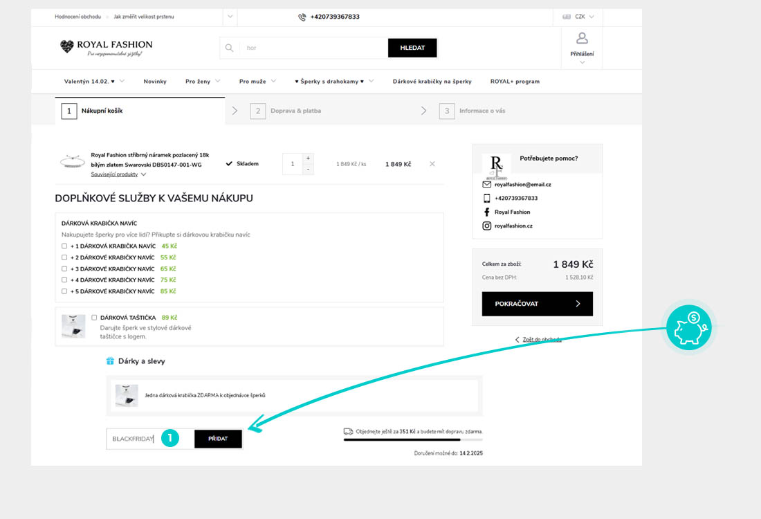 Zajímá vás více možností, jak při svém nákupu ušetřit? Perfektní. Podívejte se na stránky e-shopu, kde každý den objevíte vybrané produkty za nižší ceny a další varianty levnějšího nákupu. Zajímavá je možnost dopravy zdarma při objednávce nad určitou částku. Potěšit vás ale mohou i další akce. Během celého roku můžete pořizovat šperky levněji. Unikátní možností je věrnostní program e-shopu. Díky němu si užijete trvalé slevy na základě součtu svých nákupů. E-shop totiž odměňuje věrné zákazníky za jejich pravidelnou podporu tím, že jim poskytuje trvalé slevy na základě předchozích objednávek. Přečtěte si více o podmínkách na stránkách internetového prodejce a už dnes můžete začít se šetřením. Dodání objednávek je velmi rychlé a máte také možnost vybrat si preferovaný způsob doručení a platby. Podívat se můžete i na hodnocení e-shopu stávajícími zákazníky a možná vás přesvědčí, že stojí za to vybrat nový oblíbený doplněk v podobě šperku. V předvánočním období se můžete těšit na Royal Fashion Black Friday. Během roku můžete využít aktuální Royal Fashion kupón, který je časově limitovaný. Podívejte se na možnosti skvělého nákupu v e-shopu hned teď.