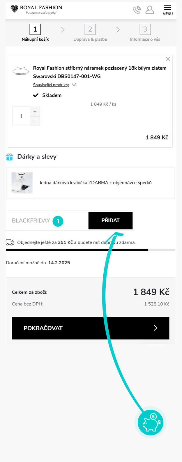 Vyberte si produkt v e-shopu Royalfashion.cz, o který máte zájem, stiskněte tlačítko "Přidat do košíku" a produkt se automaticky vloží do nákupního košíku. Přímo v nákupním košíku najdete pod vámi vybraným produktem políčko "Vložit slevový kupón". Zde vložte zkopírovaný slevový kód nebo jej ručně vepište a potvrďte tlačítkem "Přidat".