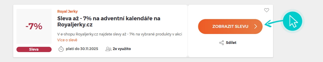 Vyberte si na naší stránce konkrétní Royal Jerky slevu a klikněte na tlačítko „Viz slevu“. Automaticky budete přesměrováni přímo na akční nabídku v internetovém obchodě royaljerky.cz, kde můžete produkt nakoupit se slevou.