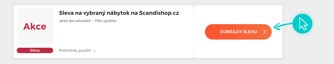 Vyberte si na naší stránce konkrétní Scandishop slevu a klikněte na tlačítko "Zobrazit slevu". Automaticky budete přesměrováni přímo na akční nabídku v internetovém obchodě Scandishop.cz, kde můžete produkt nakoupit se slevou.