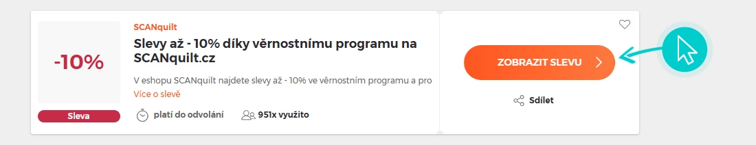 Vyberte si na naší stránce konkrétní SCANquilt slevu a klikněte na tlačítko "Získej slevu". Automaticky budete přesměrováni přímo na akční nabídku v internetovém obchodě SCANquilt.com, kde můžete produkt nakoupit se slevou.