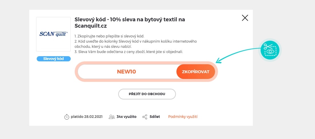 Zkopírujte nebo si opište slevový kód a klikněte na tlačítko "Přejít do obchodu". Následně budete přesměrováni přímo do e-shopu SCANquilt.com.
