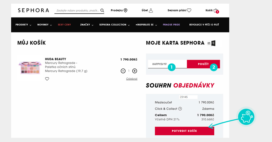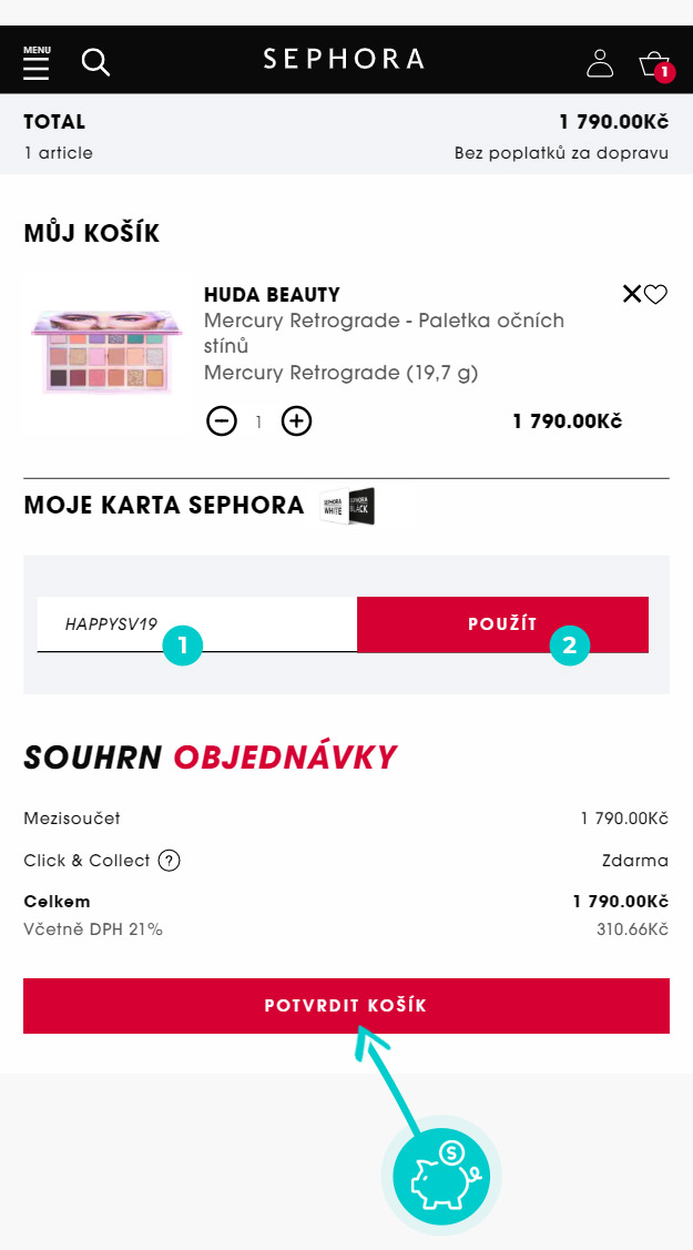 Vyberte si produkt v eshopu Sephora.cz, o který máte zájem, stiskněte tlačítko "Vložit do košíku" a produkt se automaticky vloží do nákupního košíku. Přímo v nákupním košíku najdete vedle vámi vybraným produktem políčko "Slevový kód". Zde vložte zkopírovaný slevový kód nebo jej ručně vepište a potvrďte tlačítkem "Použít".