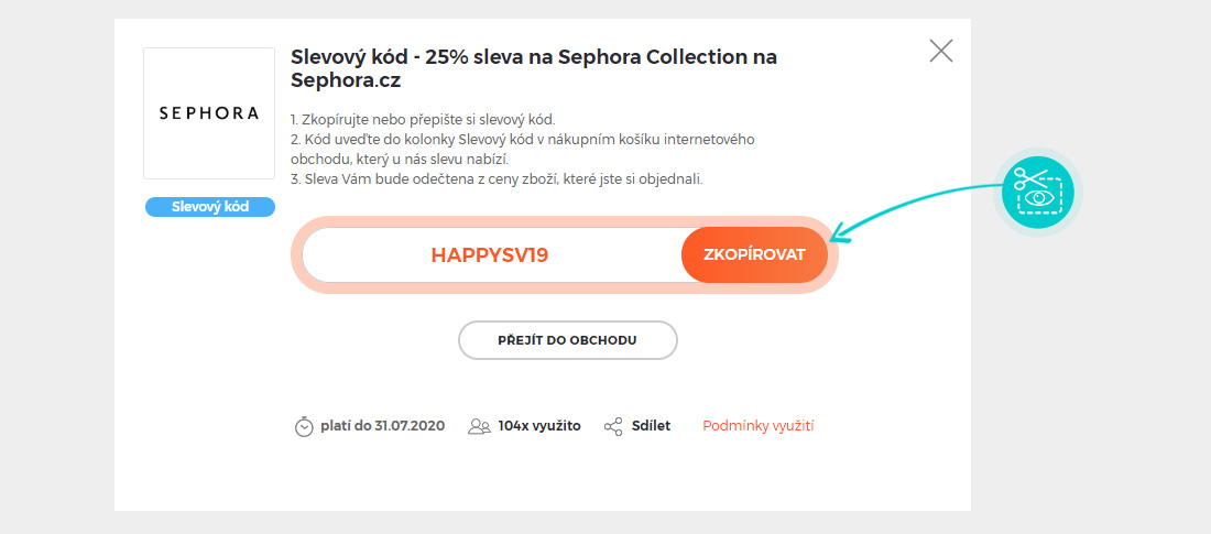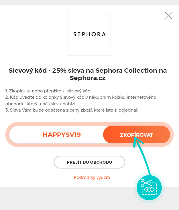 Zkopírujte nebo si opište slevový kód a klikněte na tlačítko "Přejít do obchodu". Následně budete přesměrováni přímo do eshopu Sephora.cz.
