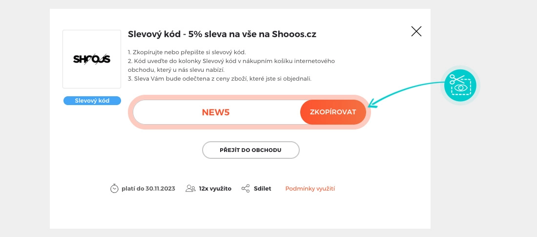 Zkopírujte nebo si odepište slevový kód a klikněte na tlačítko „Přejít do obchodu“. Následně budete přesměrováni přímo do e-shopu Shooos.cz.