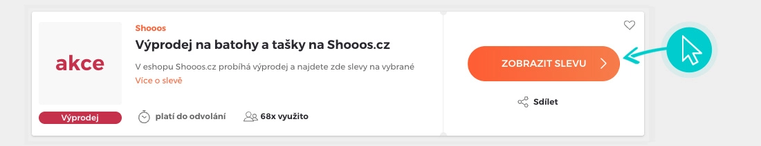 Vyberte si na naší stránce konkrétní Shooos slevu a klikněte na tlačítko „Viz slevu“. Automaticky budete přesměrováni přímo na akční nabídku v internetovém obchodě Shooos.cz, kde můžete produkt nakoupit se slevou.