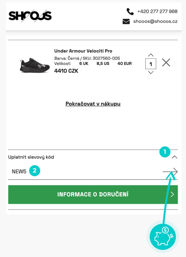 Vyberte si produkt v e-shopu Shooos.cz, o který máte zájem, stiskněte tlačítko „Do košíku“ a produkt se automaticky vloží do nákupního košíku. Přímo v nákupním košíku naleznete vpravo v části "Shrnutí" políčko „Kód kuponu“. Zde vložte zkopírovaný slevový kód nebo jej ručně vepište a potvrďte tlačítkem „Použít“.