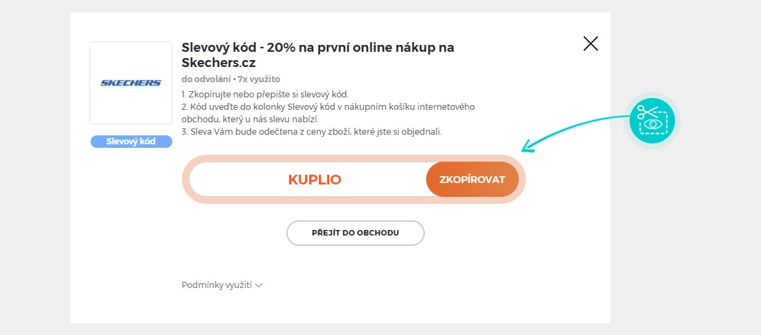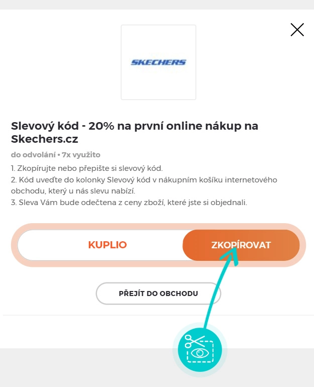 Zkopírujte nebo si opište slevový kód a klikněte na tlačítko "Přejít do obchodu". Následně budete přesměrováni přímo do eshopu Skechers.cz.