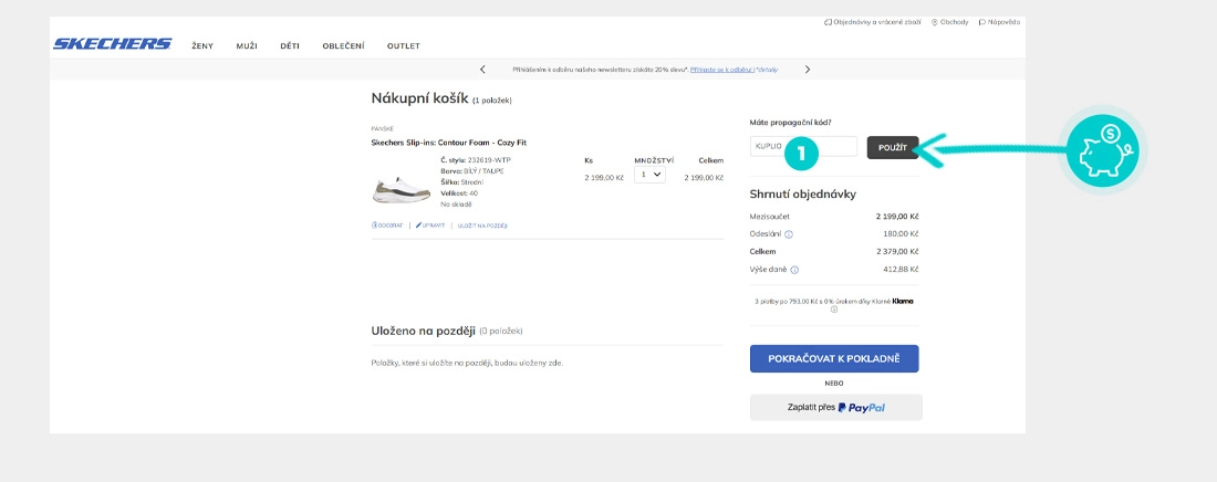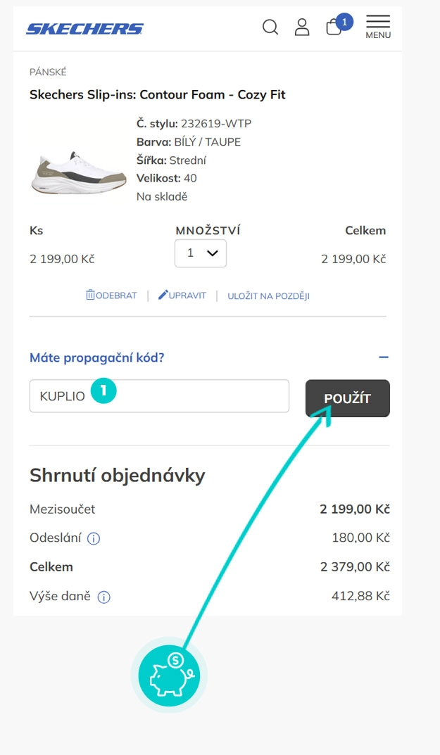 Vyberte si produkt v eshopu Skechers.cz, o který máte zájem, stiskněte tlačítko "Přidat do košíku" a produkt se automaticky vloží do nákupního košíku. Přímo v nákupním košíku vedle vybraných produktů klikněte na políčko "Zadejte svůj kód". Zde vložte zkopírovaný slevový kód nebo jej ručně vepište a potvrďte tlačítkem "Použit".