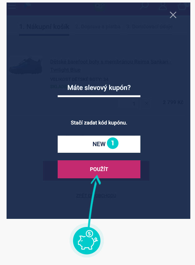 Vyberte si produkt v eshopu Skibi.cz, o který máte zájem, stiskněte tlačítko "Koupit" a produkt se automaticky vloží do nákupního košíku. Přímo v nákupním košíku najdete pod vámi vybraným produktem políčko "Máte slevový kupón?". Zde vložte zkopírovaný slevový kód nebo jej ručně vepište a potvrďte tlačítkem "Použít".
