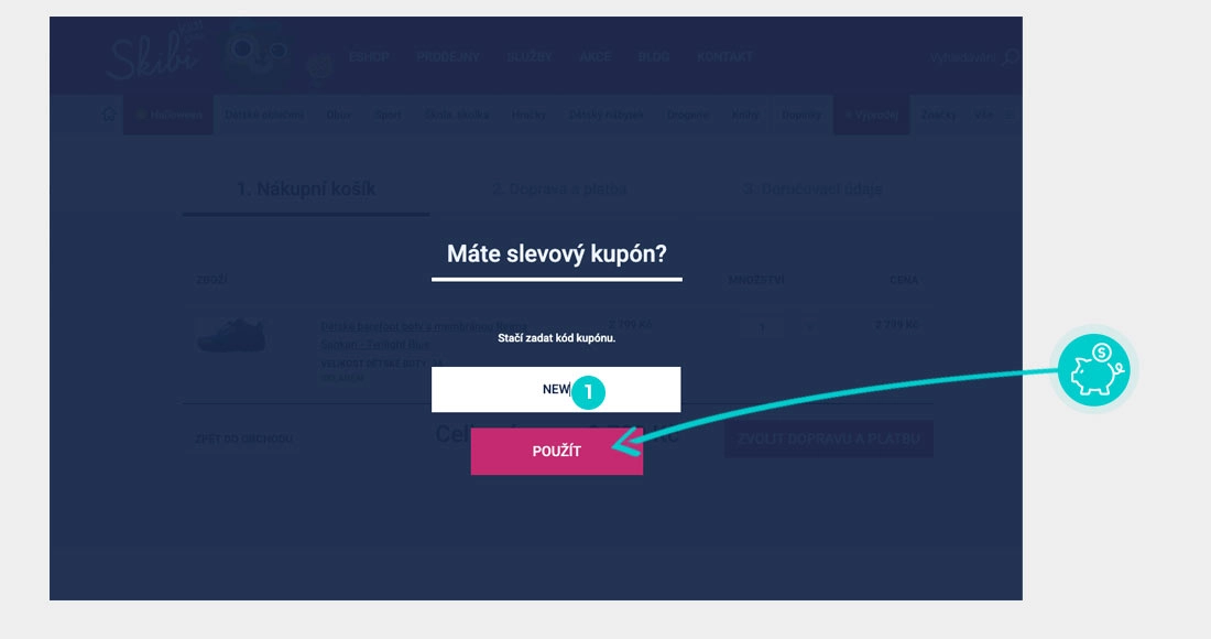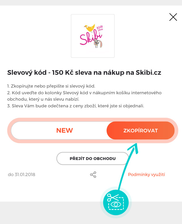 Zkopírujte nebo si opište slevový kód a klikněte na tlačítko "Přejít do obchodu". Následně budete přesměrováni přímo do eshopu Skibi.cz.