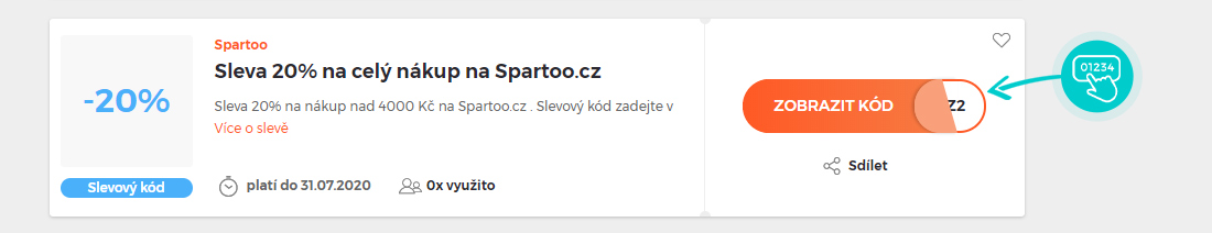 Vyberte si konkrétní slevový kód na naší stránce, který si chcete uplatnit v eshopu Spartoo.cz. Klikněte na oranžové tlačítko "Zobrazit kód".