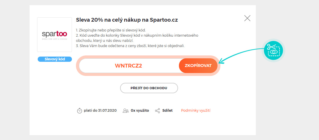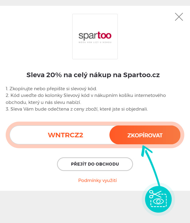 Zkopírujte nebo si opište slevový kód a klikněte na tlačítko "Přejít do obchodu". Následně budete přesměrováni přímo do eshopu Spartoo.cz.