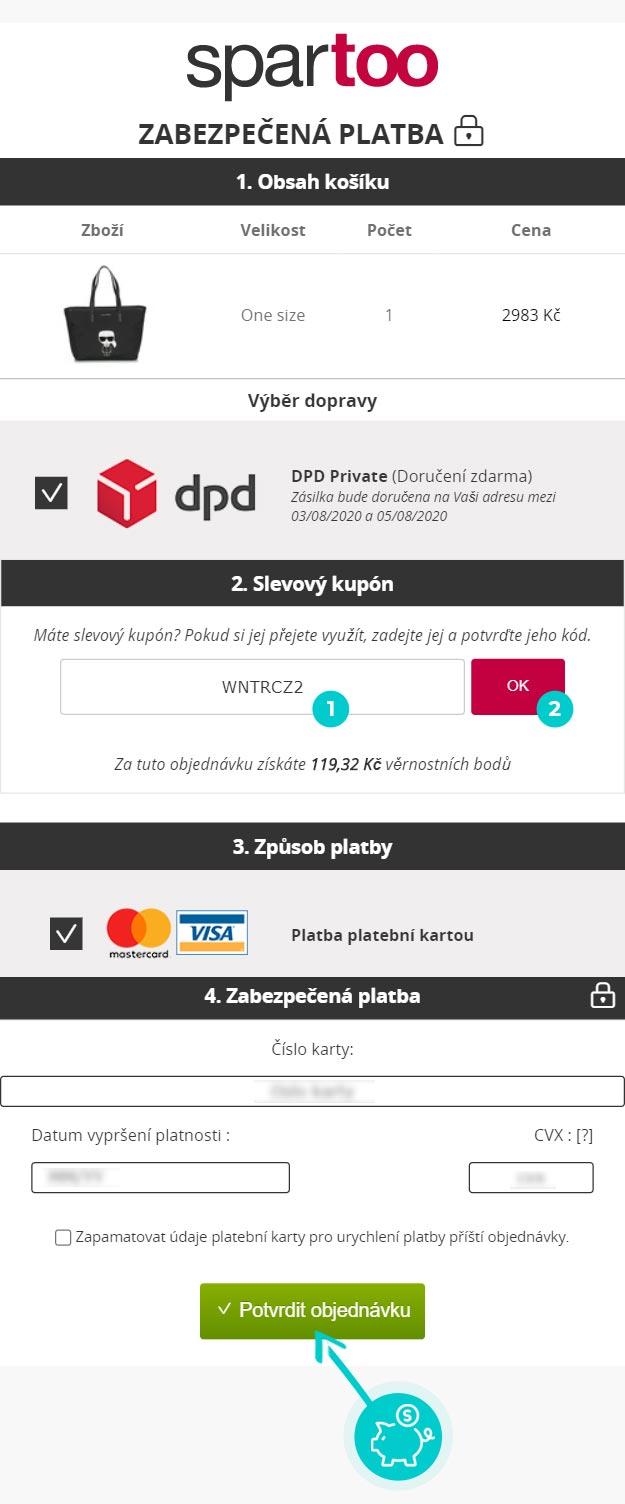 Vyberte si produkt v eshopu Spartoo.cz, o který máte zájem, stiskněte tlačítko "Přidat do košíku" a produkt se automaticky vloží do nákupního košíku. V objednávce v kroku č. 1 „Obsah košíku“ najdete pod vámi vybraným produktem políčko "Slevový kupón". Zde vložte zkopírovaný slevový kód nebo jej ručně vepište a potvrďte tlačítkem "Ok".