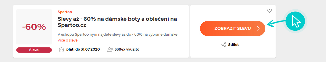Vyberte si na naší stránce konkrétní Spartoo slevu a klikněte na tlačítko "Zobrazit slevu". Automaticky budete přesměrováni přímo na akční nabídku v internetovém obchodě Spartoo.cz, kde můžete produkt nakoupit se slevou.