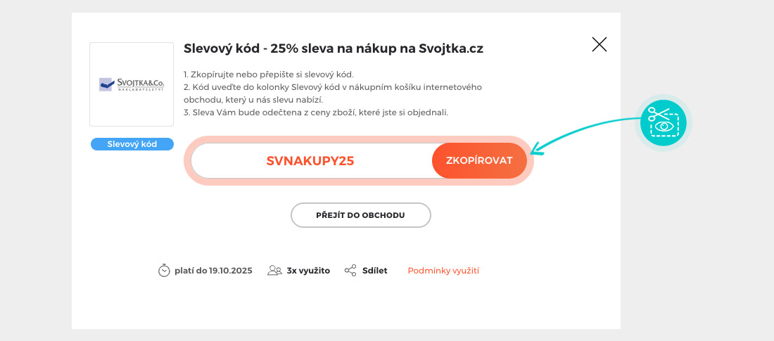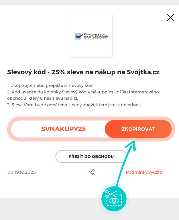 Zkopírujte nebo si odepište slevový kód a klikněte na tlačítko „Přejít do obchodu“. Následně budete přesměrováni přímo do eshopu Svojtka.cz.