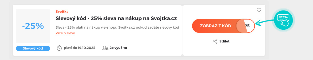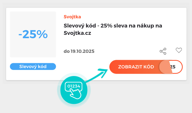 Vyberte si konkrétní slevový kód na naší stránce, který si chcete uplatnit v eshopu Svojtka.cz. Klepněte na oranžové tlačítko „Zobrazit kód“.