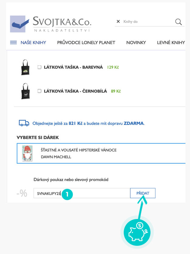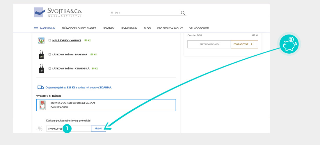 Vyberte si produkt v eshopu Svojtka.cz, o který máte zájem, stiskněte tlačítko „Do košíku“ a produkt se automaticky vloží do nákupního košíku. Přímo v nákupním košíku naleznete vlevo políčko „Dárky a slevy“. Zde vložte zkopírovaný slevový kód nebo jej ručně vepište a potvrďte tlačítkem „Přidat“.