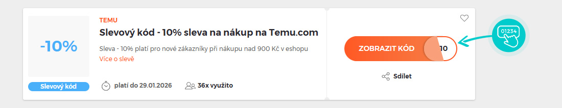 Vyberte si konkrétní slevový kód na naší stránce, který si chcete uplatnit v e-shopu Temu.com. Klikněte na oranžové tlačítko "Zobrazit kód".