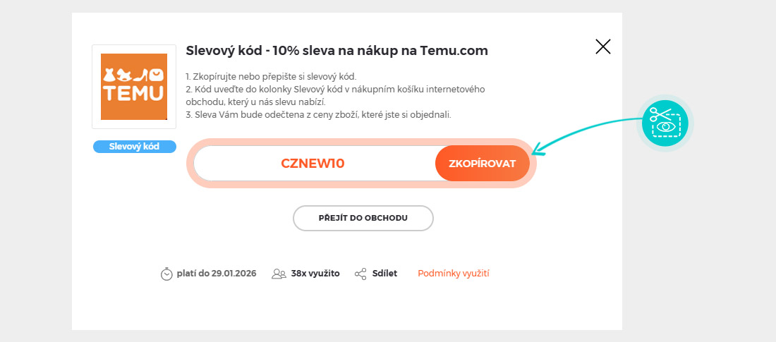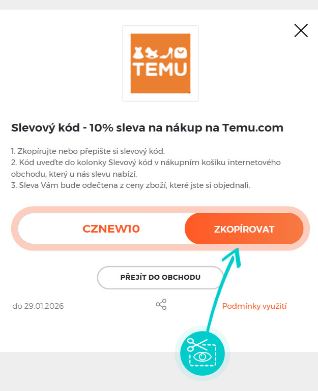 Zkopírujte nebo si opište slevový kód a klikněte na tlačítko "Přejít do obchodu". Následně budete přesměrováni přímo do e-shopu Temu.com.