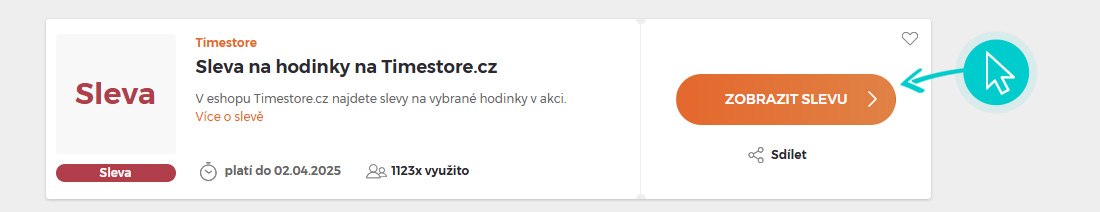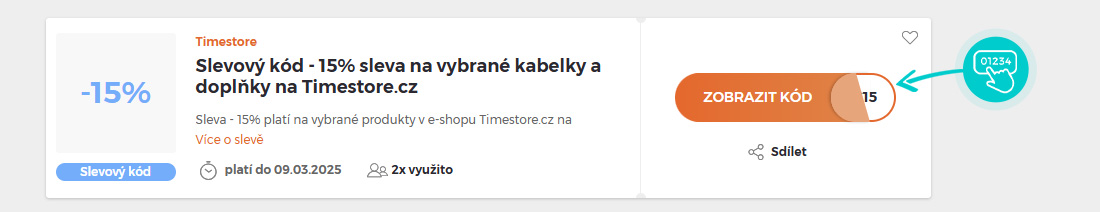 Vyberte si konkrétní slevový kód na naší stránce, který si chcete uplatnit v e-shopu Timestore.cz. Klikněte na oranžové tlačítko "Zobrazit kód".