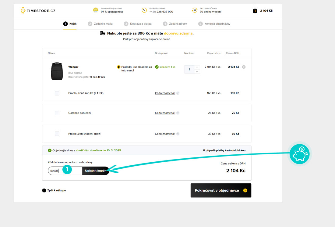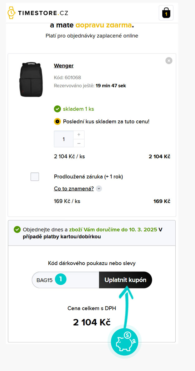 Vyberte si produkt v e-shopu Timestore.cz, o který máte zájem, stiskněte tlačítko "Přidat do košíku" a produkt se automaticky vloží do nákupního košíku. Přímo v nákupním košíku najdete pod vámi vybraným produktem políčko "Kód dárkového poukazu nebo slevy". Zde vložte zkopírovaný slevový kód nebo jej ručně vepište a potvrďte tlačítkem "Uplatnit kupón".