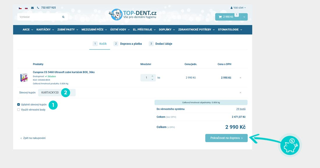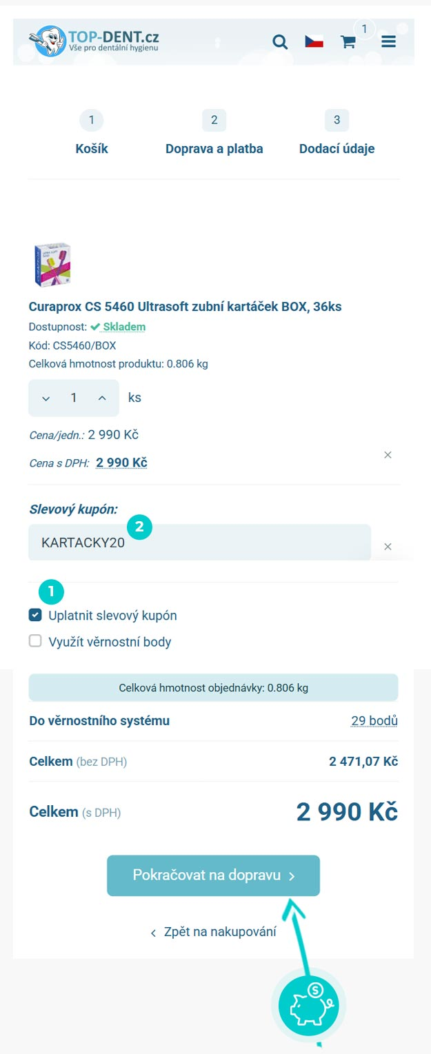 Vyberte si produkt v eshopu Top-dent.cz, o který máte zájem, stiskněte tlačítko "Vložit do košíku" a produkt se automaticky vloží do nákupního košíku. Přímo v nákupním košíku vedle vybraných produktů klikněte na políčko "Kód poukazu". Zde vložte zkopírovaný slevový kód nebo jej ručně vepište a potvrďte tlačítkem "Uplatnit".