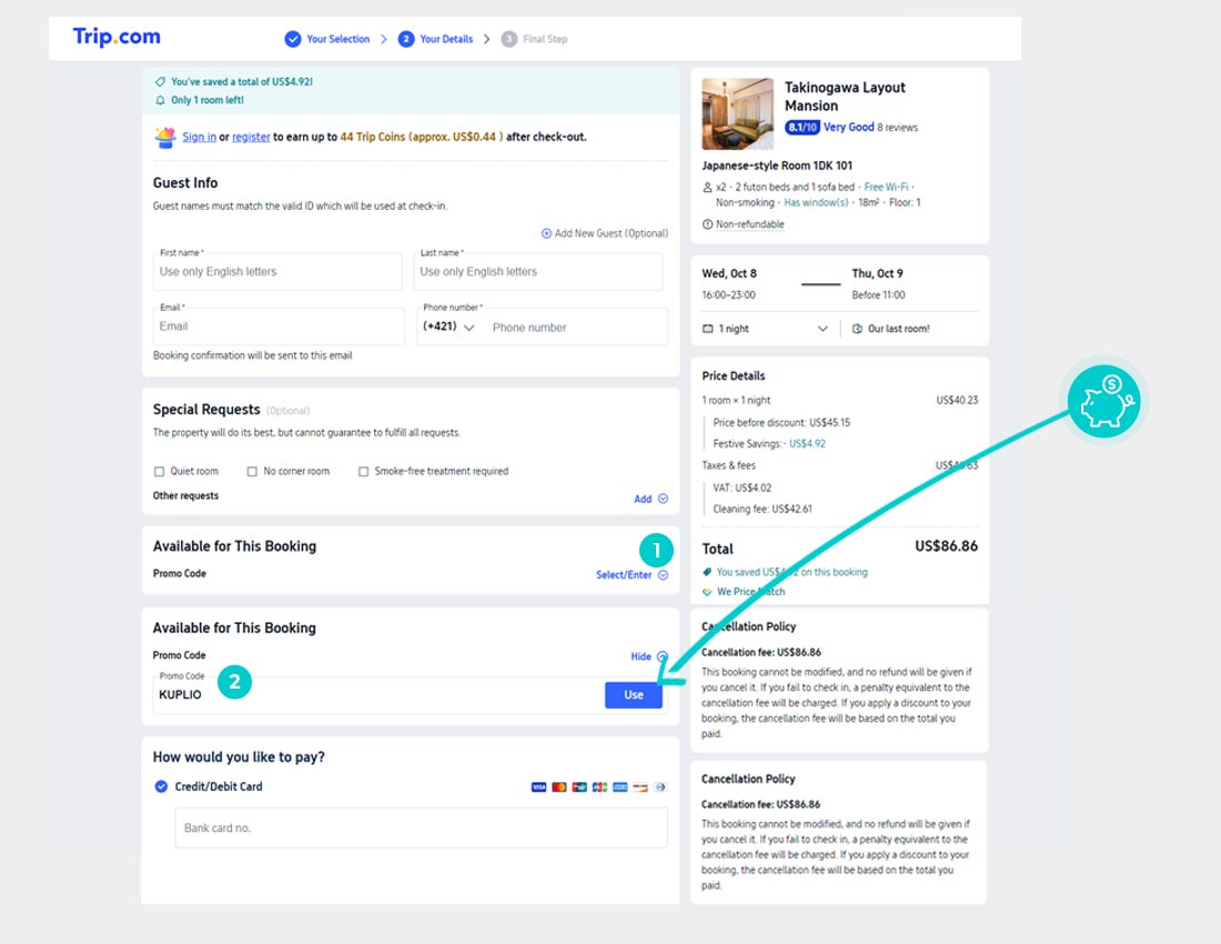Vyberte si nabídku v e-shopu Trip.com, o kterou máte zájem, stiskněte tlačítko „Reserve“ a nabídka se automaticky vloží do nákupního košíku. Přímo v nákupním košíku naleznete políčko „Promo codes“. Zde vložte zkopírovaný slevový kód nebo jej ručně vepište a potvrďte tlačítkem „Verify“.