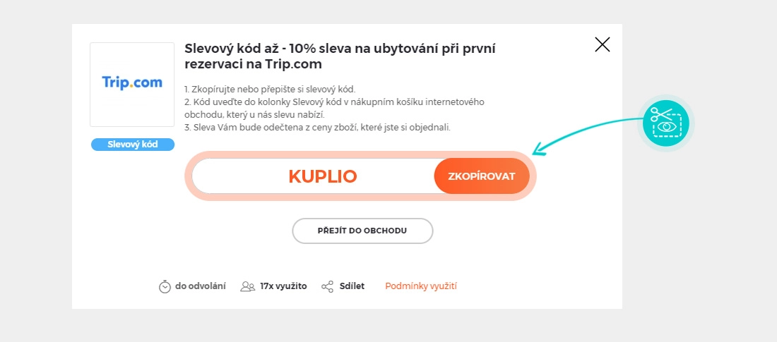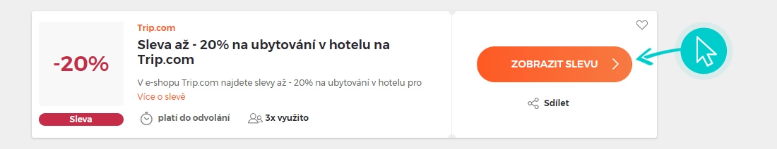 Vyberte si na naší stránce konkrétní Trip.com slevu a klikněte na tlačítko „Viz slevu“. Automaticky budete přesměrováni přímo na akční nabídku v internetovém obchodě Trip.com, kde můžete produkt nakoupit se slevou.