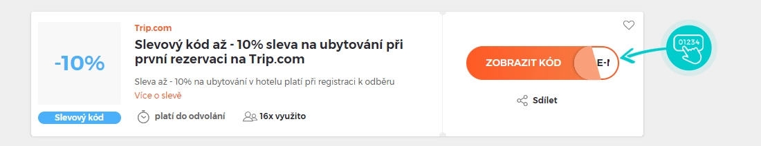 Vyberte si konkrétní slevový kód na naší stránce, který si chcete uplatnit v e-shopu Trip.com. Klepněte na oranžové tlačítko „Zobrazit kód“.