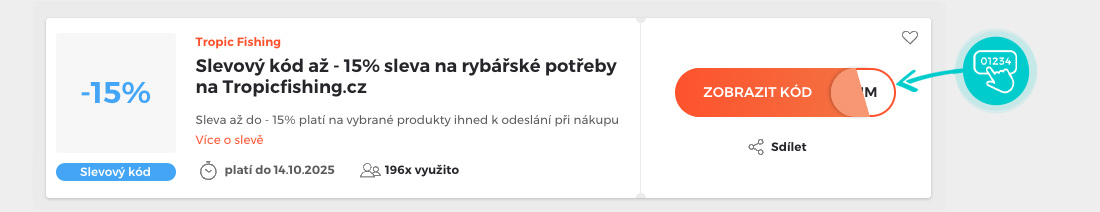 Vyberte si konkrétní slevový kód na naší stránce, který si chcete uplatnit v e-shopu Tropicfishing.cz. Klikněte na oranžové tlačítko "Zobrazit kód".