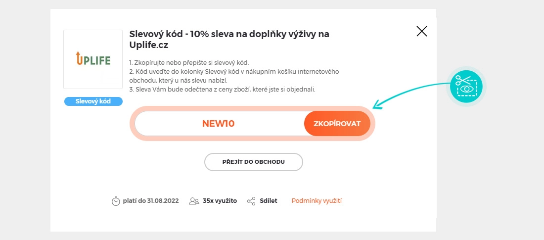 Zkopírujte nebo si opište slevový kód a klikněte na tlačítko "Přejít do obchodu". Následně budete přesměrováni přímo do e-shopu Uplife.cz.