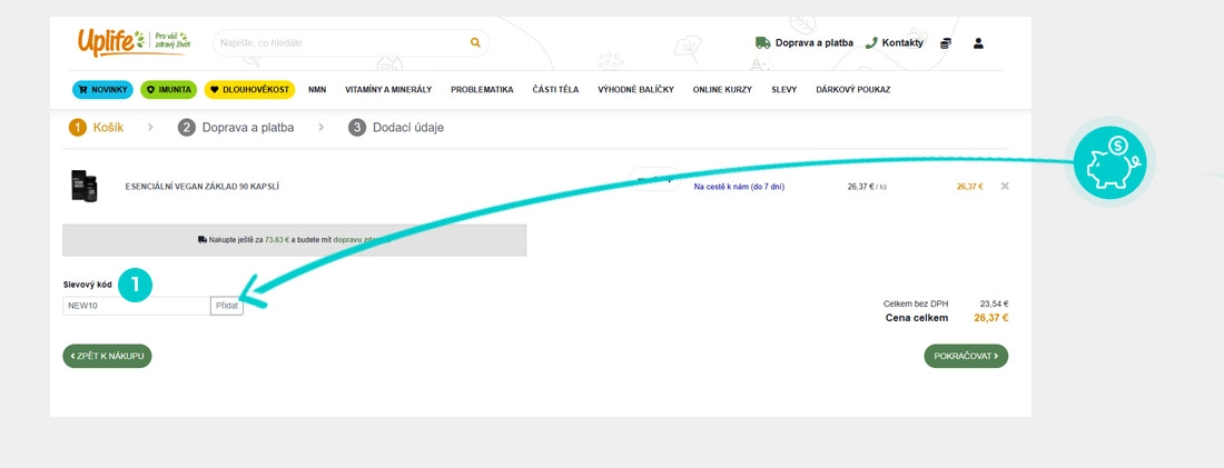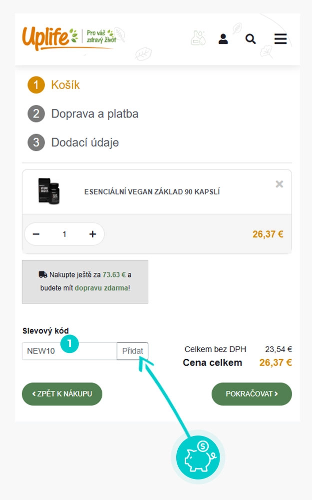 Vyberte si produkt v e-shopu Uplife.cz, o který máte zájem, stiskněte tlačítko "Přidat do košíku" a produkt se automaticky vloží do nákupního košíku. Přímo v nákupním košíku najdete pod vámi vybraným produktem políčko "Slevový kód". Zde vložte zkopírovaný slevový kód nebo jej ručně vepište a potvrďte tlačítkem "Přidat".
