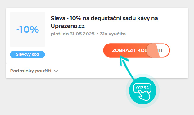 Vyberte si konkrétní slevový kód na naší stránce, který si chcete uplatnit v eshopu Uprazeno.cz. Klikněte na oranžové tlačítko "Zobrazit kód".