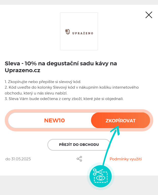 Zkopírujte nebo si opište slevový kód a klikněte na tlačítko "Přejít do obchodu". Následně budete přesměrováni přímo do eshopu Uprazeno.cz.