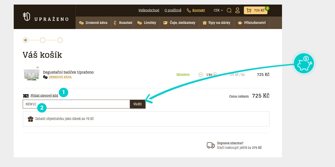 Vyberte si produkt v eshopu Uprazeno.cz, o který máte zájem, stiskněte tlačítko "Do košíku" a produkt se automaticky vloží do nákupního košíku. Přímo v nákupním košíku pod vybranými produkty klikněte na políčko "Přidat slevový kód" a otevře se "Slevový kupón". Zde vložte zkopírovaný slevový kód nebo jej ručně vepište a potvrďte tlačítkem "Vložit".
