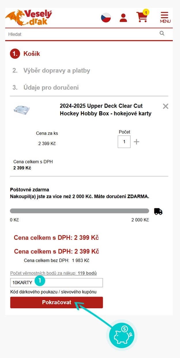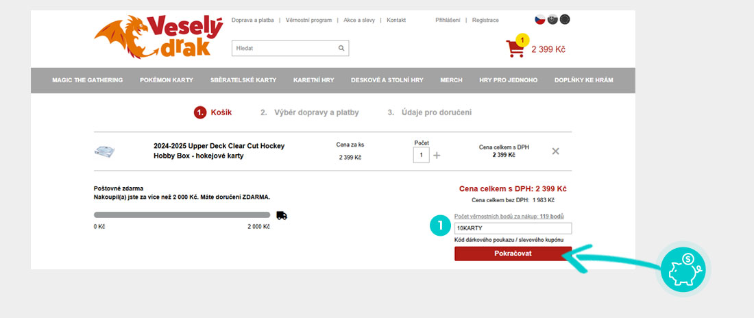 Vyberte si produkt v e-shopu Vesely-drak.cz, o který máte zájem, stiskněte tlačítko "Přidat do košíku" a produkt se automaticky vloží do nákupního košíku. Přímo v nákupním košíku najdete pod vámi vybraným produktem políčko "Kód dárkového poukazu/slevového kupónu". Zde vložte zkopírovaný slevový kód nebo jej ručně vepište a potvrďte tlačítkem "Pokračovat".
