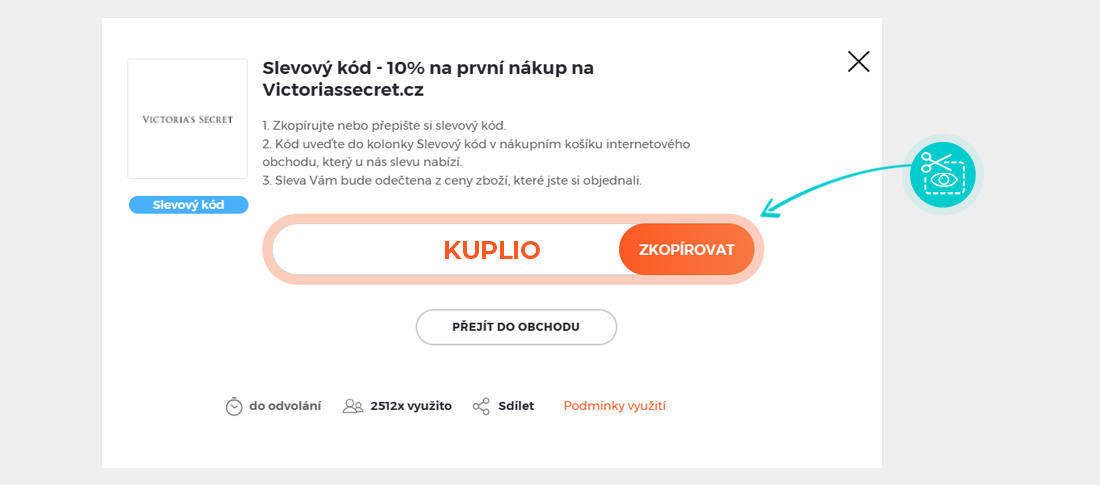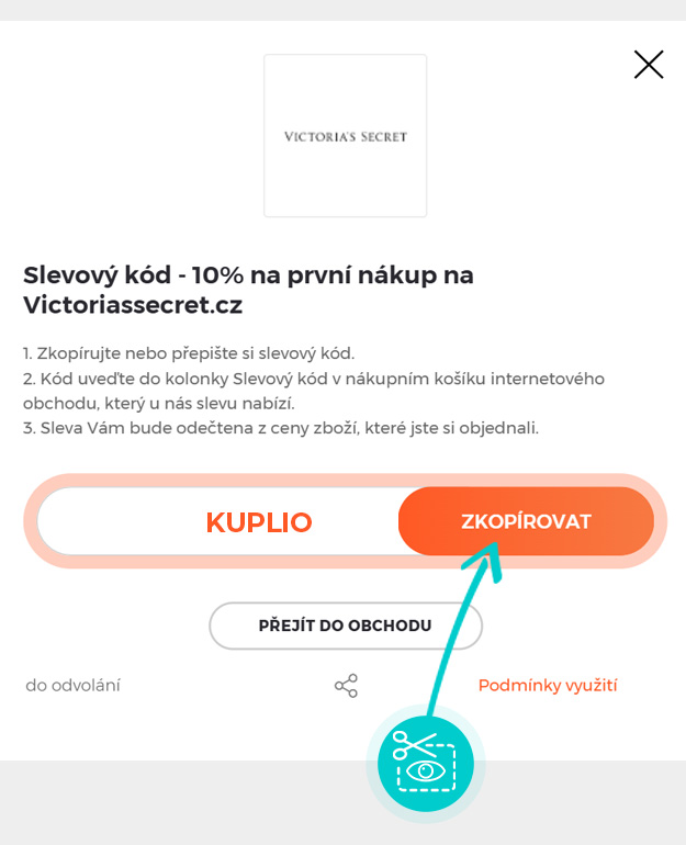 Zkopírujte nebo si opište slevový kód a klikněte na tlačítko "Přejít do obchodu". Následně budete přesměrováni přímo do e-shopu Victoriassecret.cz.