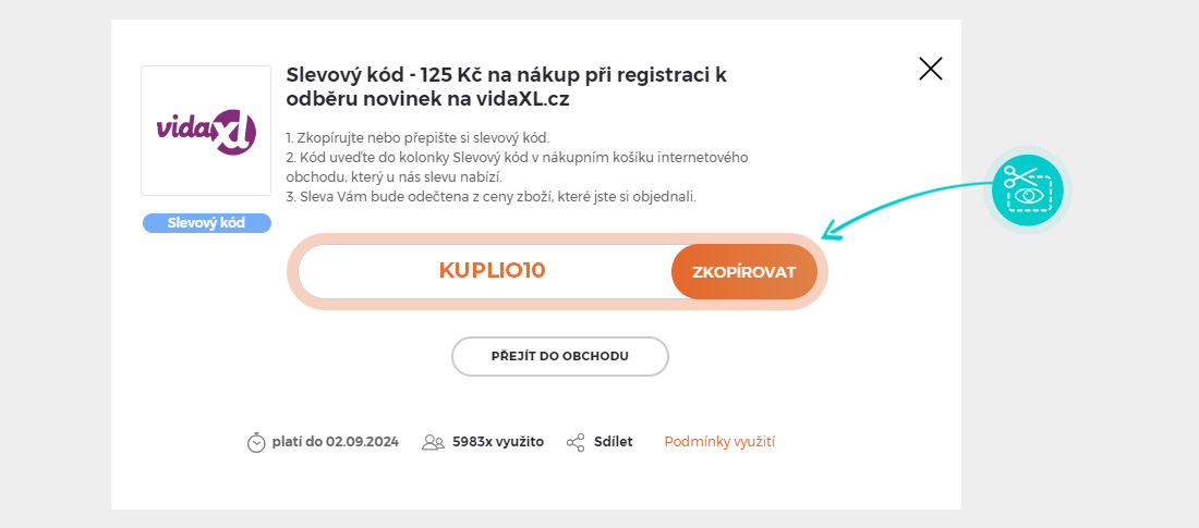 Zkopírujte nebo si opište slevový kód a klikněte na tlačítko "Přejít do obchodu". Následně budete přesměrováni přímo do e-shopu vidaXL.cz.