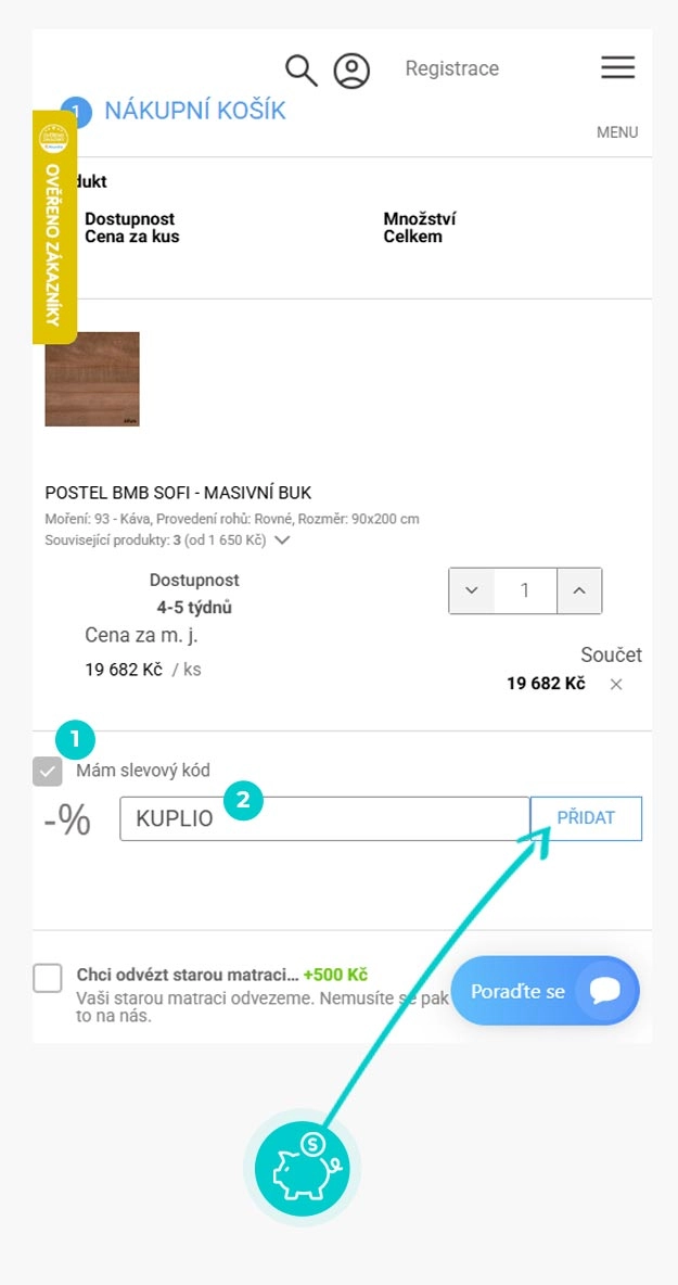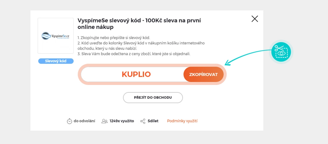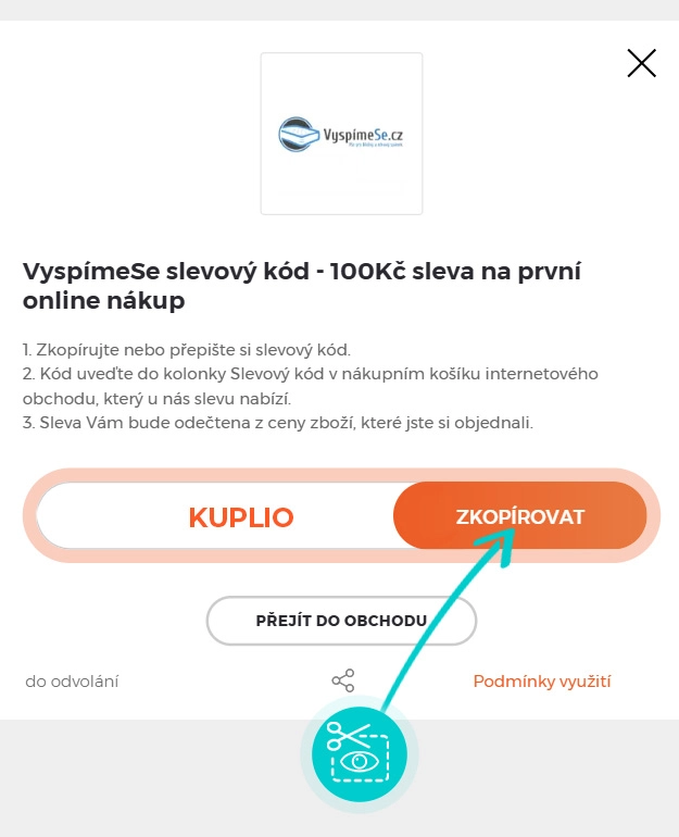 Zkopírujte nebo si opište slevový kód a klikněte na tlačítko "Přejít do obchodu". Následně budete přesměrováni přímo do eshopu Vyspimese.cz.